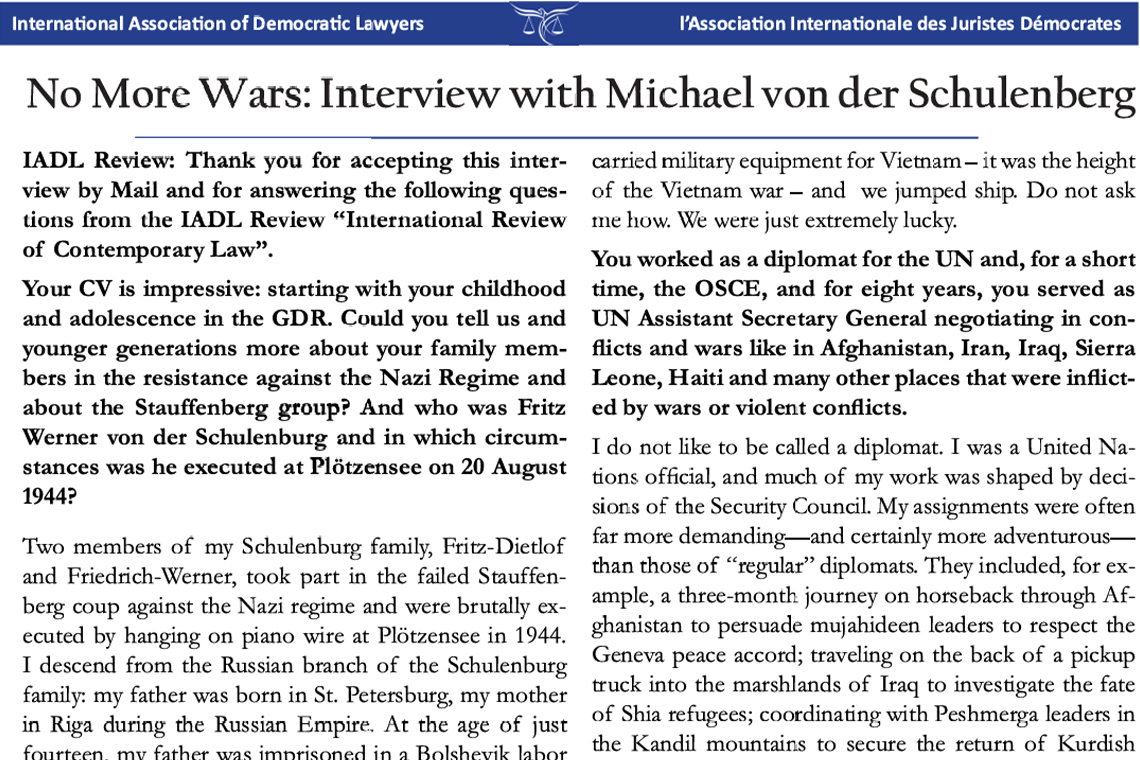 IADL Review: Thank you for accepting this interview by Mail and for answering the following questions from the IADL Review “International Review of Contemporary Law”. Your CV is impressive: starting with your childhood and adolescence in the GDR. Could you tell us and younger generations more about your family members in the resistance against the…